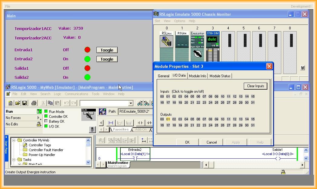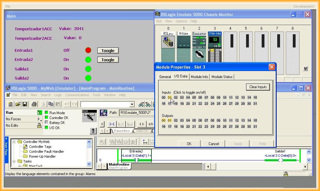 5.- Ya podemos ejecutar nuestro Runtime y observar los resultados, hacemos uso del simulador para forzar las entradas, tambien se puede comprobar como el RSLinx esta activo y los items que esta sirviendo.