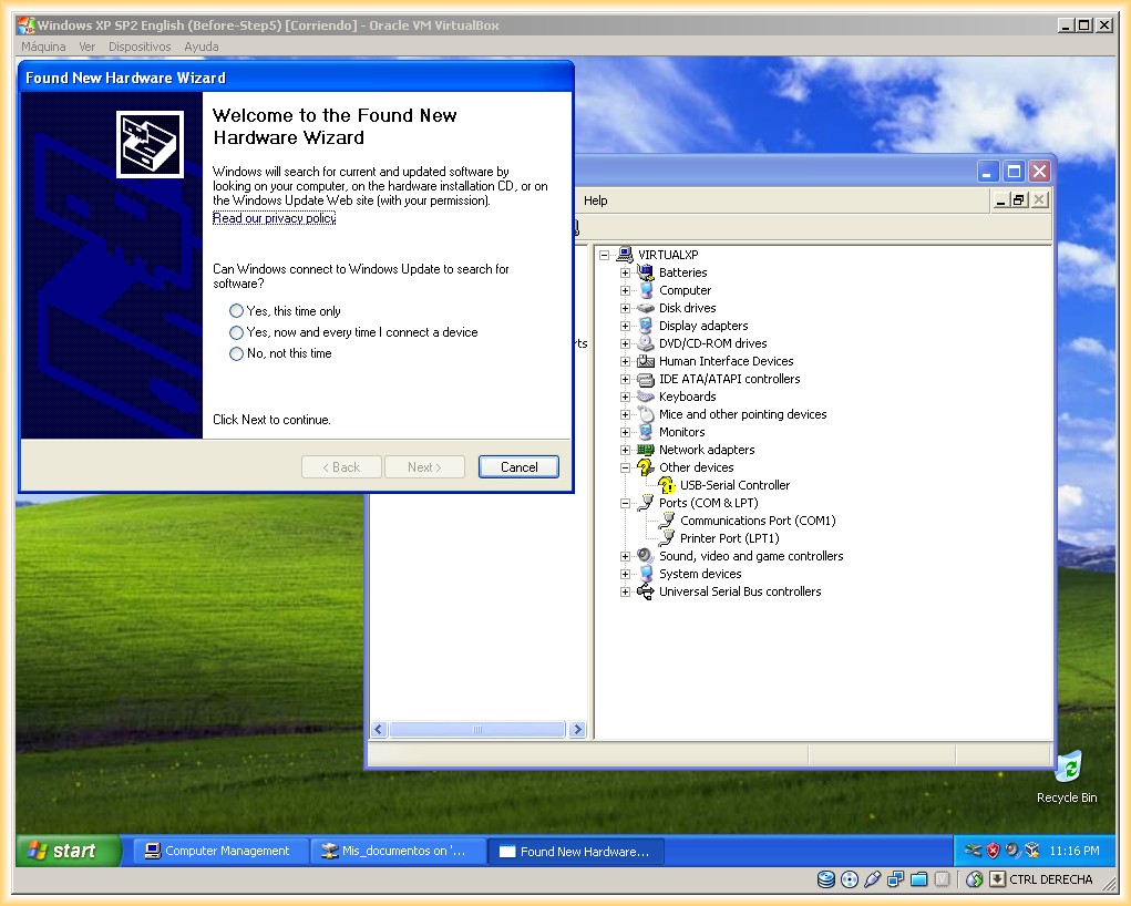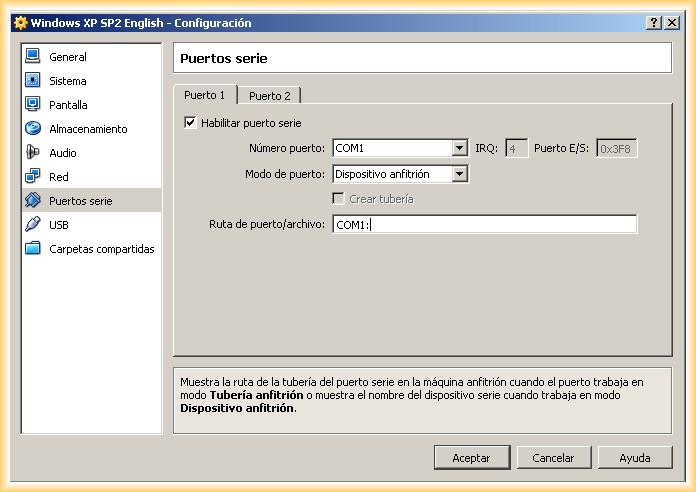 Como las pruebas las estoy haciendo en un equipo con puerto serie RS-232 aprovecharé para utilizar el puerto serie en la máquina virtual.