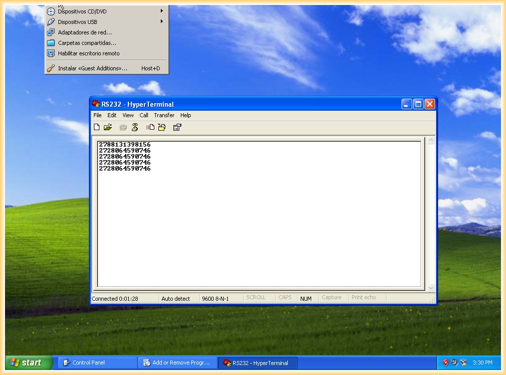 1.- Para comprobar que funciona correctamente el puerto serie, he conectado un lector de códigos de barras en el puerto serie y he ejecutado el Hiperterminal de Windows,esto demuestra que funciona perfectamente.