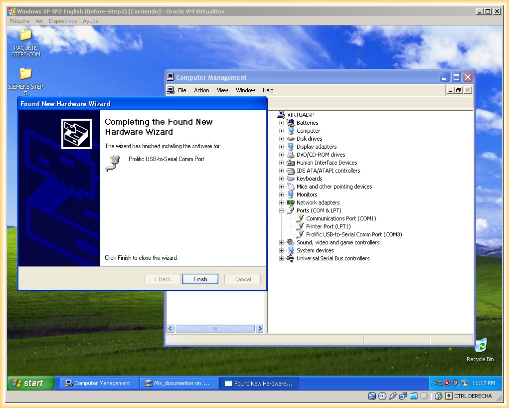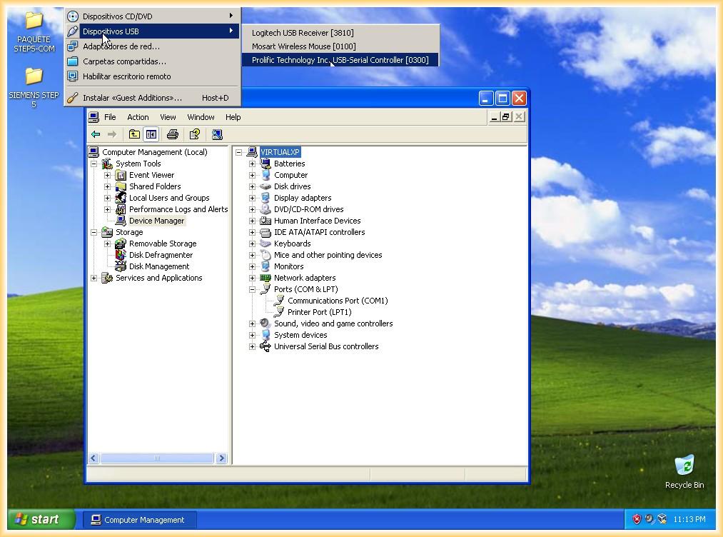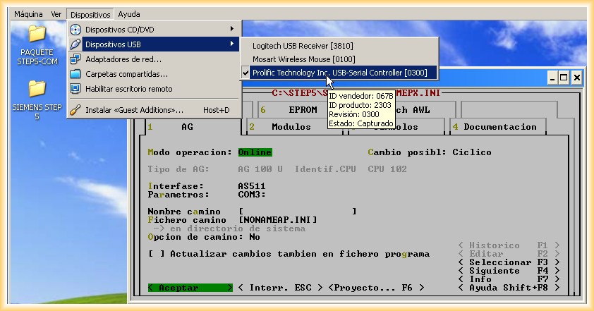 En esta práctica vamos a configurar un adaptador USB-RS232 para comunicar con automatas S5 tanto en una máquina real como en una virtual, para la máquina virtual usaremos el Virtual Box en su última versión V 4.1.18 y un Sistema Operativo Windows XP SP2-SP3, aunque esta probado el funcionamiento con VirtualBox y VMWare 7.0. El Sistema Operativo de la Máquina Anfitrión (real) es Windows XP SP3