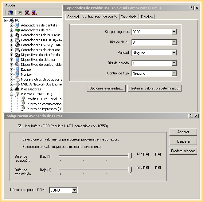 2.- Una vez instalados los drivers, nos vamos a administrador de dispositivos -> Seleccionamos nuestro USB-to-Serial -> Vamos a sus propiedades -> Opciones avanzadas y seleccionamos que nuestro puerto COM será el COM3