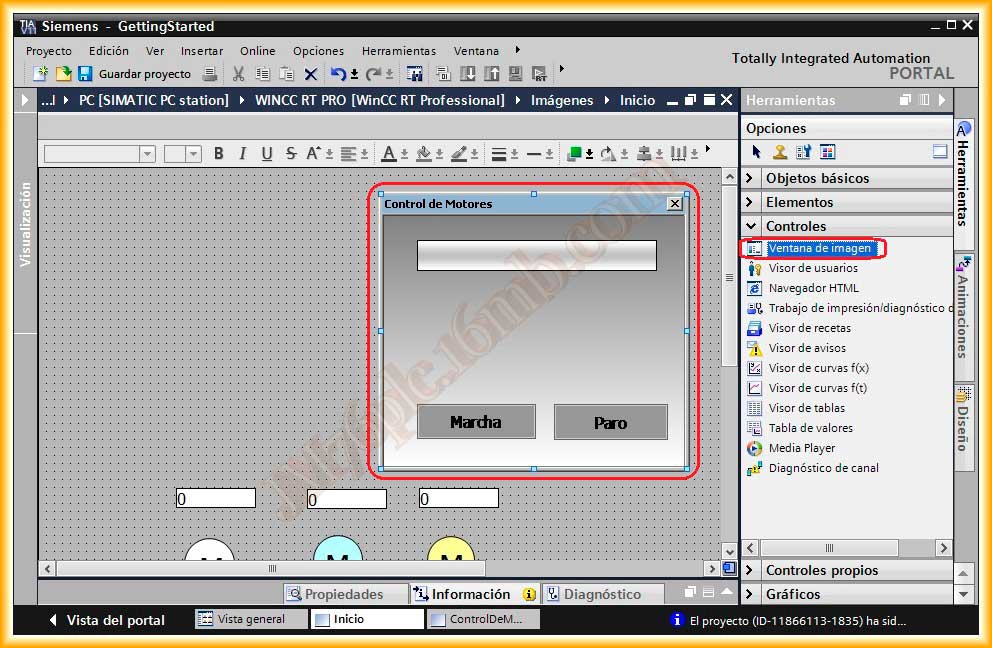 Insertamos en nuestra imagen que en mi caso se llama Inicio, una ventana de imagen que esta a su vez contedra la imagen ControlDeMotores