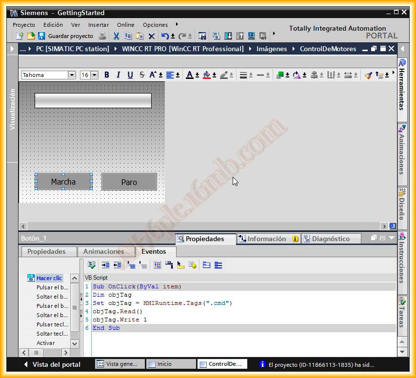 En el botón de Marcha, añadimos al evento click el siguiente código, donde el nombre de la variable es ".cmd" ya que al definir el SetTagPrefix todos los objetos heredan este con lo cual la variable a manipular es nombreVariable.cmd, aunque el punto podemos subtituirlo por un _ o - u otra referencia en común en todas la variables.