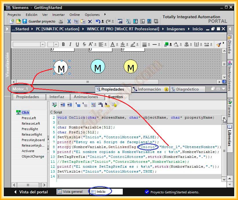 Por último vamos a definir el evento que se ejecutara al hacer click sobre el objeto, que es el mismo código que ya usamos salvo que ha cambiado el nombre de alguna función del WinCC V7 a TIA WinCC