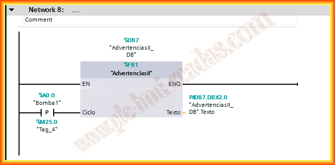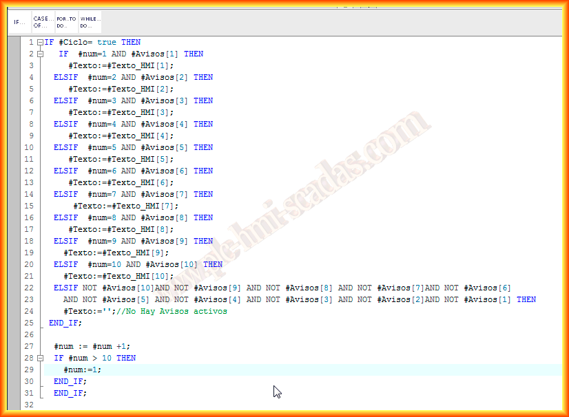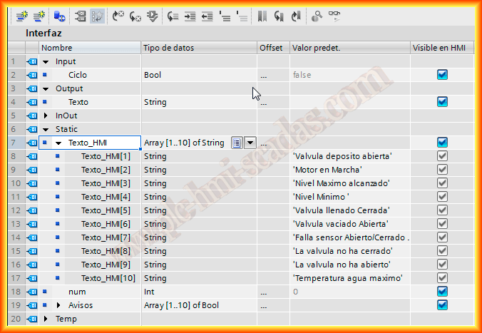 Este pequeño ejemplo esta dedicado a Luis. La idea es mostrar en un Panel, un string que vaya mostrando una seria de avisos, alarmas, pasos activados en una secuencia etc... para ello vamos a crear un FB al que he llamado advertencias, como variable de entrada he declarado Ciclo, que será el tiempo en ir mostrando los avisos e ir comprobando si esta activado o no, como variable de salida esta declarada Texto que será la que vincularemos en el HMI como campo de Salida del tipo String.