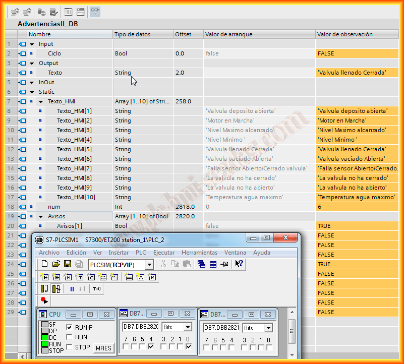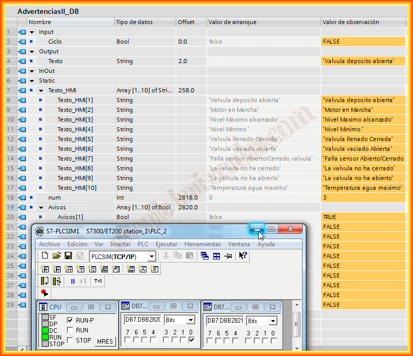 Voy a comprobar el funcionamiento con el PLCSIM y funciona correctamente según la idea principal, aquí observabamos el DB asociado a nuestro FB y forzamos los bits de la zona de memoria DB7.DBX2820.0