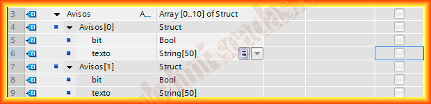 Como variables estáticas hay declarado un Array de bit, que corresponderan a los diferentes avisos, y un array de string que contendrá el texto a mostrar, una forma mas elegante hubiese sido declarar una estructura como la imagen que se muestra.