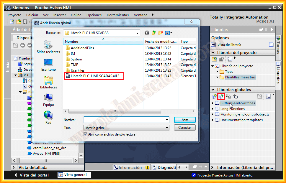 Suponiendo que hemos guardado y cerrado la libreria y necesitamos de su uso, abrimos el proyecto en el que nos interese reutilizar una función y los primero que hacemos es abrir la libreria, vamos al directorio donde se guardo y notese que la extensión para las librerias es *.al12, 12 porque se ha creado con TIA Portal V.12