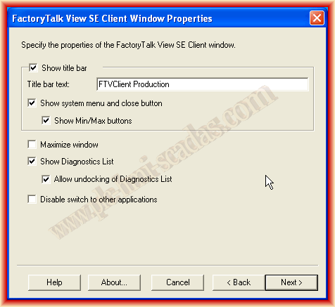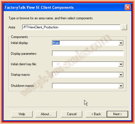 Automáticamente podemos seleccionar cualquier aplicación que haya creada en el Servidor y que sea del tipo Network, nuestro ejemplo FTViewServer y seleccionamos los checkbox que nos interesen, seguidamente seleccionamos el Area y la imagen inicial.