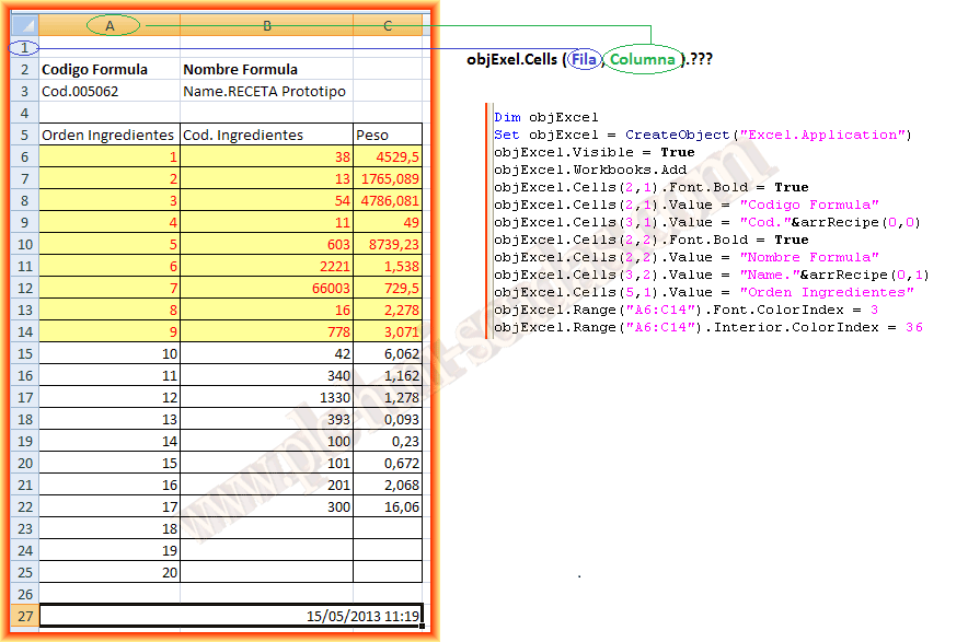 Ahora vamos a ir explicando el proceso que he seguido, en esta primera parte hemos instanciado un objeto del tipo Excel.Aplication, lo hacemos visible y añadimos un Workbooks en el que vamos a trabajar. A continuación ponemos los encabezados y del array extraemos el código y el nombre.