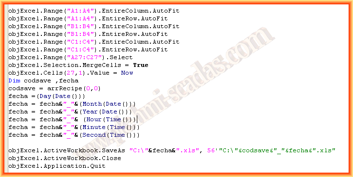 Para guardar el archivo hemos hecho una concatenación de los datos extraidos de dia,mes y año de la función Date() y de la función Time() extraemos hora,minuto y segundos, todo ello lo guardamos en la variable fecha y guardamos con ese nombre nuestro libro excel. Una vez guardado se cierra y listo.