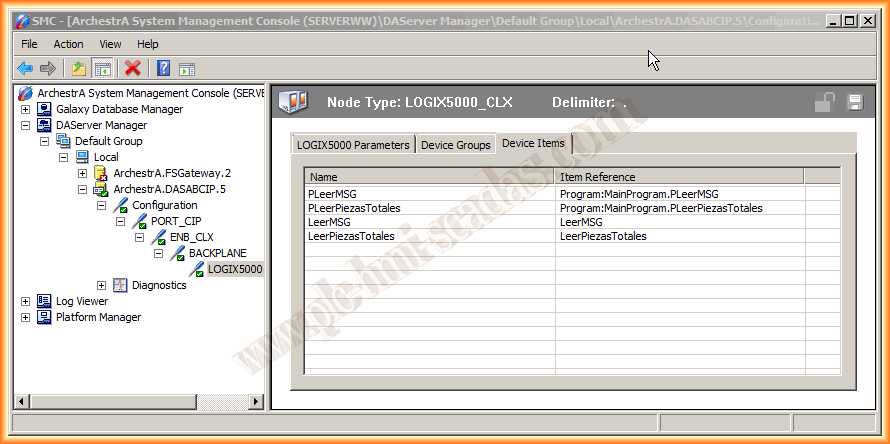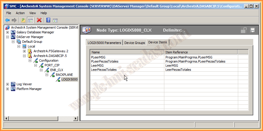 Cambiamos de pestaña a Device Items, donde configuraremos todos nuestros items, tags, al basarse en RSLogix5000 las direcciones ItemReference van en referencia dependiendo del tipo de tag que sea, aquí dos ejemplos de tags que pertenecen al programa principal y dos tags que son a nivel de controlador