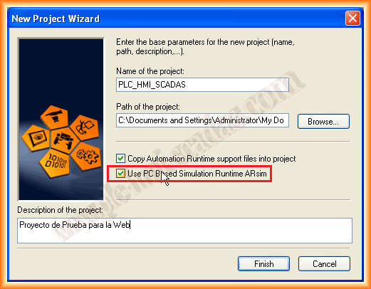 Como el objetivo es probarlo, vamos a crear un nuevo programa, y seleccionar el checkbox de usar el PC con el simulador ARsim, le asignamos el nombre que nos interese y la ruta o dejamos por defecto la suya.