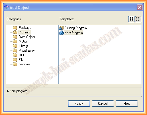 Lo próximo que vamos a hacer es añadir un nuevo objeto, el cual nos muestra una nueva ventana donde observamos todos los objetos que podemos crear. Seleccionamos dentro de Program -> New Program y siguiente