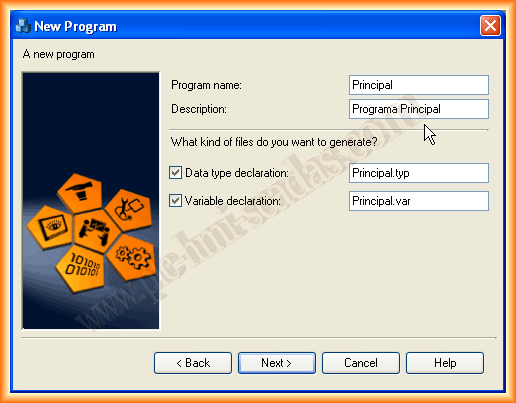El asistente nos pide el nombre de nuestro programa, el tipo de archivo de variables que queremos crear en caso de que nos interese, si no seleccionamos ninguno de ellos, las variables las declarariamos como Globales, pero es conveniente crear para cada programa sus variables, pulsamos en siguiente y nos pide que tipo de archivos de programa queremos crear, el ciclico por defecto se creara automáticamente, pero tenemos la posiblidad de crear uno de inicio y uno de fin.