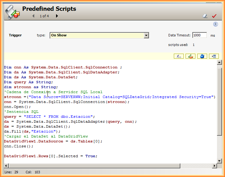 Dentro de los Scripts, en esta ocasión solo vamos a definir el tipo predefinido On Show, para cuando aparezca nuestro símbolo en nuestra pantalla muestre directamente los datos que nos interese