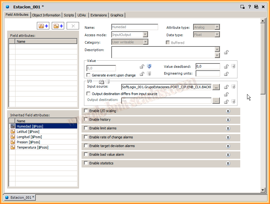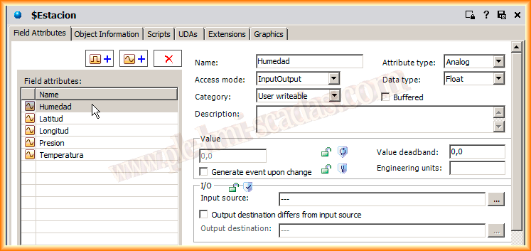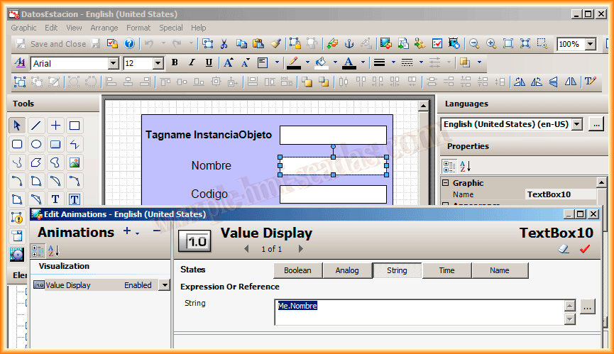 Y aquí viene la parte interesante de esta practica, ya hemos visto los atributos que tiene una estación pues dependiendo de si es del tipo String o Analog, eso será lo que variará en cada TextBox ,por lo demás la Expression or Reference que vamos a usar es Me.NombreAtributo , para Nombre será Me.Nombre, la función del Me es como en visual Basic, hace referencia asi mismo, de la misma forma configuramos todos los TextBoxs