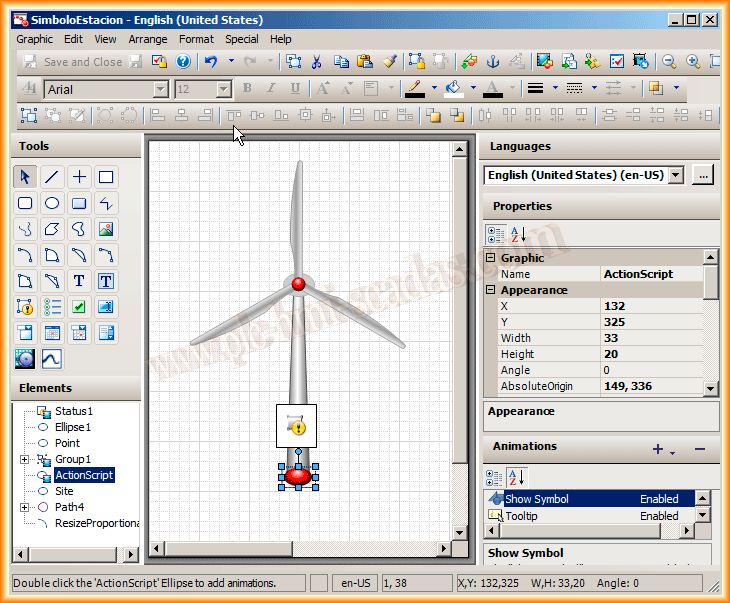 Dentro de los Graphics de nuestro Objeto Estación, de he asignado un símbolo, algo parecido a un molino eólico, que vamos a ver que le hemos implementado.