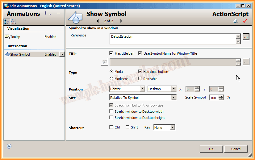 Con lo cual, salvo la animación de rotación, la animación que nos interesa es la de Show Symbol como se puede observar en la imagen, y el símbolo que nos mostrará será DatosEstación.