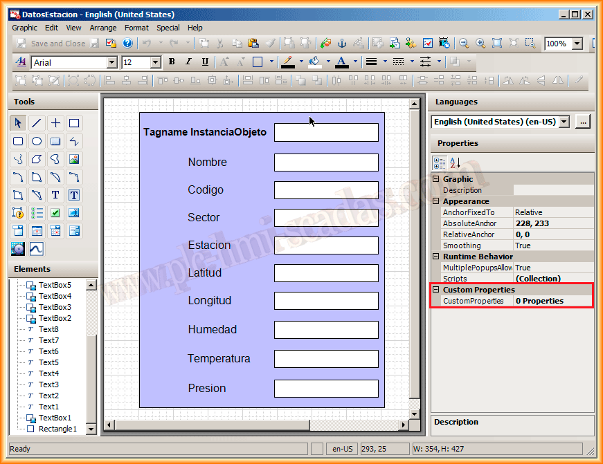 Ahora a su vez, vamos a ver el Símbolo DatosEstación para comprobar que tenemos que programar en el. Como ya señalo en la imagen, no posee ninguna Custom Properties, tampoco tiene ningún script configurado.