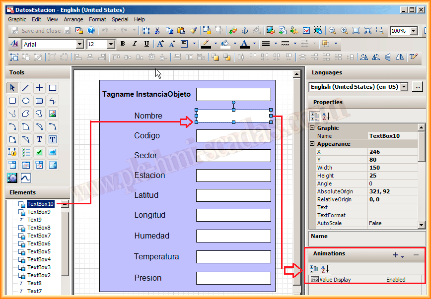 Como se observa, el símbolo esta creado a partir de Text Para hacer de Labels y TextBox para mostrar información. Cada TextBox tiene configurada la animación Value Display