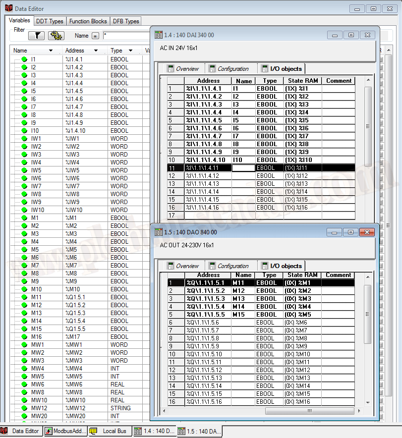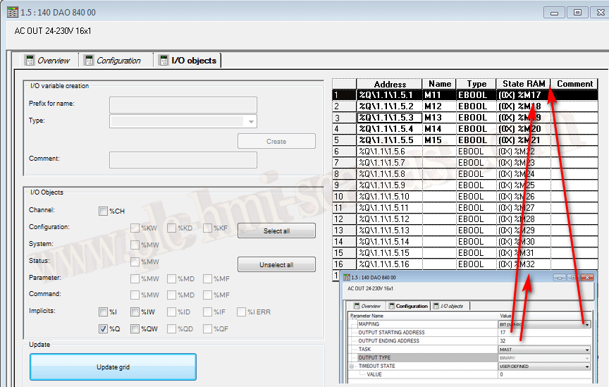 Ejemplo la variable definida como M1 esta mapeada a la dirección %M1 y a su vez la variable definida como M11 apunta a Q1.5.1 que es la misma dirección que %M1