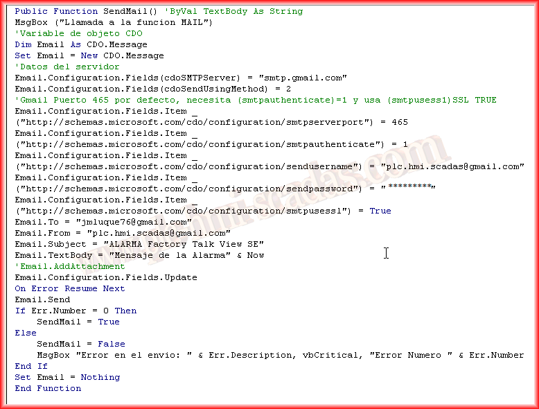 La función en cuestión es la siguiente, declaramos una variable del tipo CDO.Message y una vez declarada y dada de alta, lo que hacemos es pasarle los parámetros del Servidor SMTP, en este caso Gmail y los argumentos que usamos cuando enviamos un correo.