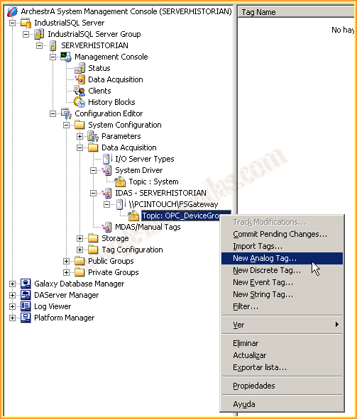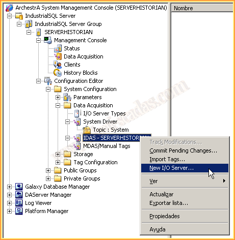 En la siguiente práctica vamos a ver como configurar un nuevo enlace en el Historian de Wonderware para registrar los valores de las variables que nos interesan. IndustrialSQL es el nombre en versiones anteriores, Historian en las nuevas versiones a partir del 2012, pero la configuración la podremos aplicar en ambos casos. Partimos de la base que ya tenemos instalado el Historian, y nos centraremos en la configuración de un nuevo Servidor I/O.