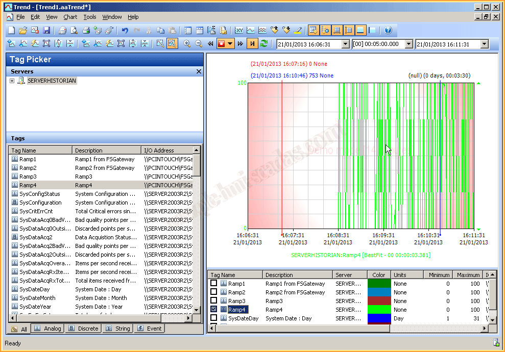 Con nuestro ServidorHistorian, puesto en funcionamiento, con todos sus servicios, ya podemos comprobar su funcionamiento, para ello hacemos uso del Trend, donde hemos agregado el Servidor y podemos observar las variables que hemos definido al igual que si la queremos visualizar la Gráfica comprobamos que funciona correctamente.