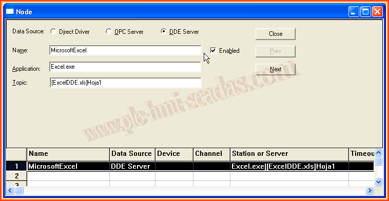 Para ello vamos al directorio Node y vamos a crear uno nuevo, seleccionando el RadioButton DDEServer, le asignamos el nombre que nos interese en Name, en el campo Aplication, para Microsoft Excel será Excel.exe y el nombre del Tópico es el nombre del archivo con su extensión mas el nombre de la hoja