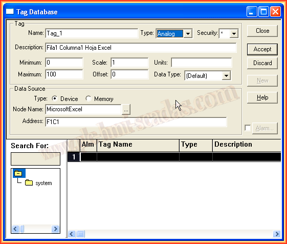 Una vez creado el enlace, lo próximo que vamos a realizar es la creación de los Tags, esto lo hacemos dentro de TagDatabase, donde en el campo Node Name, asignamos el Nodo que acabamos de crear