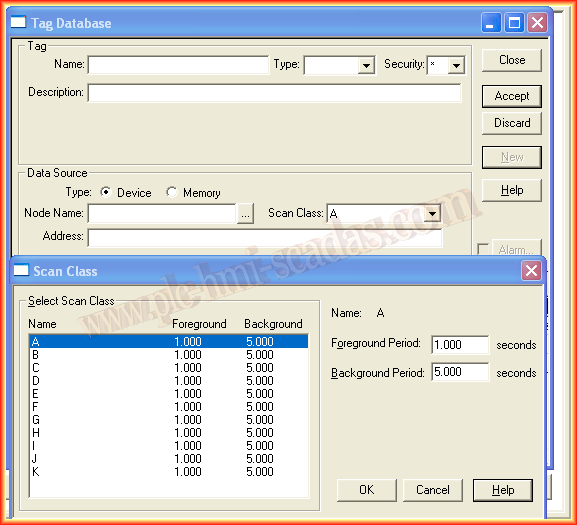 Un ejemplo seria el siguiente, al crear un nuevo Tag, queda habilitado ScanClass para seleccionar una de sus opciones. También se observa la ventana de Configuración Scan Class, donde previamente especificaremos el tiempo que nos interese.