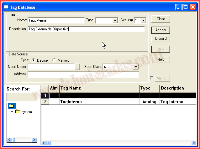 Una vez que ya hemos visto como configurar los canales Configuración de Canales "Channel" en RSView32 o Configuración Node con Servidor OPC para la configuración de un Data Source ya podemos crear los Tags de Dispositivo (Device). Los Tags de Memoria son Tags internos que no precisan de la configuración de ningún Dispositivo, estos son los dos tipos de Tags que podemos tener, vamos a ver un ejemplo de cada uno de ellos.