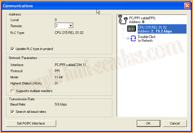 Después de todos los cambios posibles en la configuración del PG/PC Interface, el resultado era el mismo. Solución: Simplemente pasar el PLC al modo Stop y automáticamente ya lo detecta sin problemas como se puede observar en la siguietne imagen.
