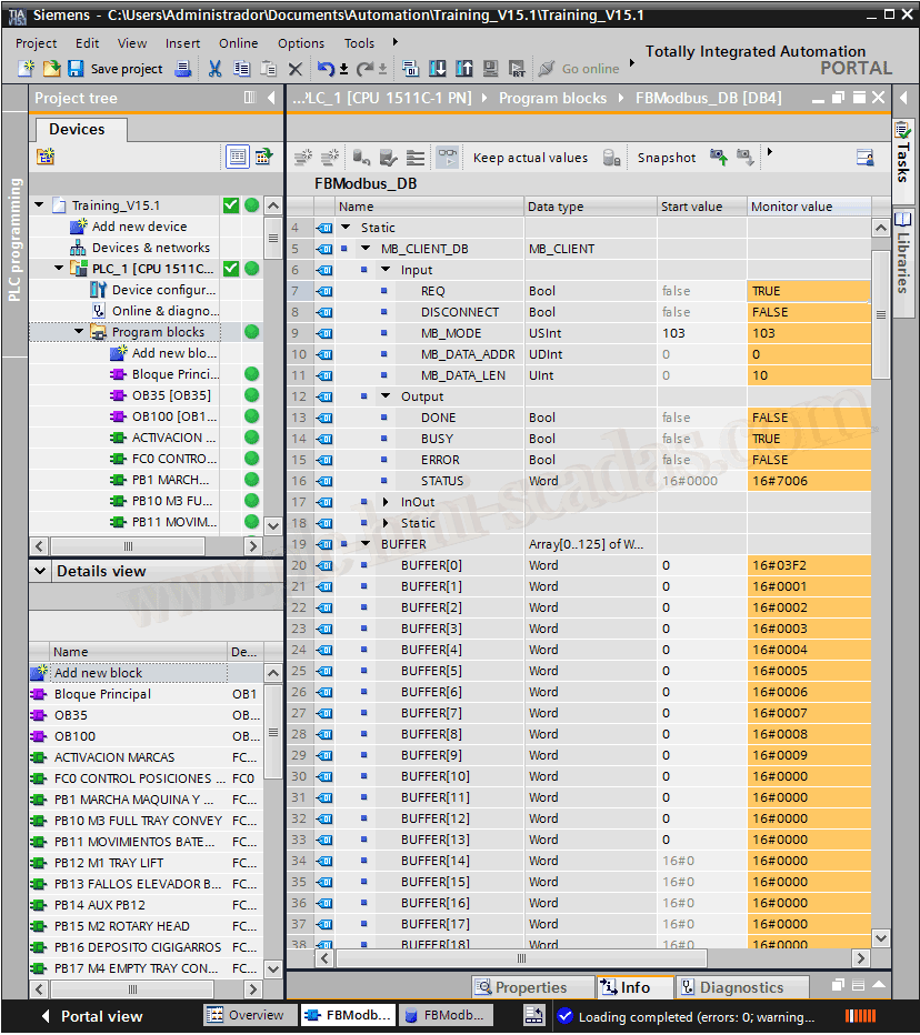 Y aquí el DB de Instancia donde tenemos toda la información, y si observamos el Array, en los primeros 10 registros empezando por el 1, tenemos los valores que hemos leido del PLC Schneider.