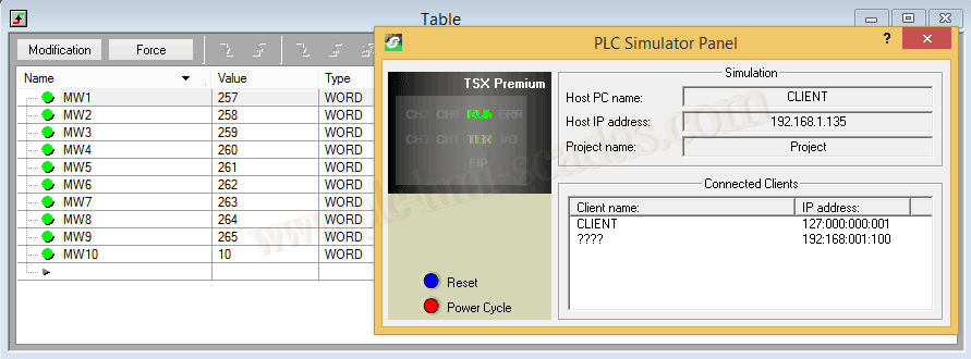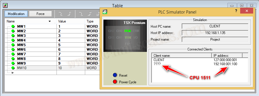 Aquí observamos como hay una conexión que el simulador no especifica el nombre, pero que equivale a la CPU 1511, con dirección IP 192.168.1.100, y observamos como hemos leido el valor de estas variables.