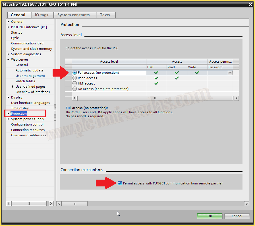 En las propiedades, vamos a las opciones Protección / Protection, tenemos que dar acceso Total y habilitar el checkBox de PUT / GET para permitir las comunicaciones.