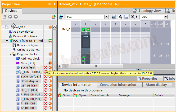 Con la versión TIA Portal v12 fue la primera liberada para programar CPU 1500. Insertamos nuestra CPU y una de las caracteristicas es que no coincide el firmware