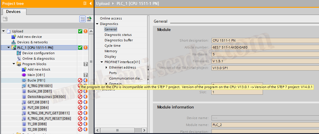 Conclusión: Si queremos hacer un Upload, debemos conocer que versión se utilizo para realizar el Download del programa, para no ir probando con todas la versiones, podemos utilizar la caracteristica que posee las ultimas versiones, que si nos ponemos Online nos dice la versión del TIA Portal que se utilizo para el programa.