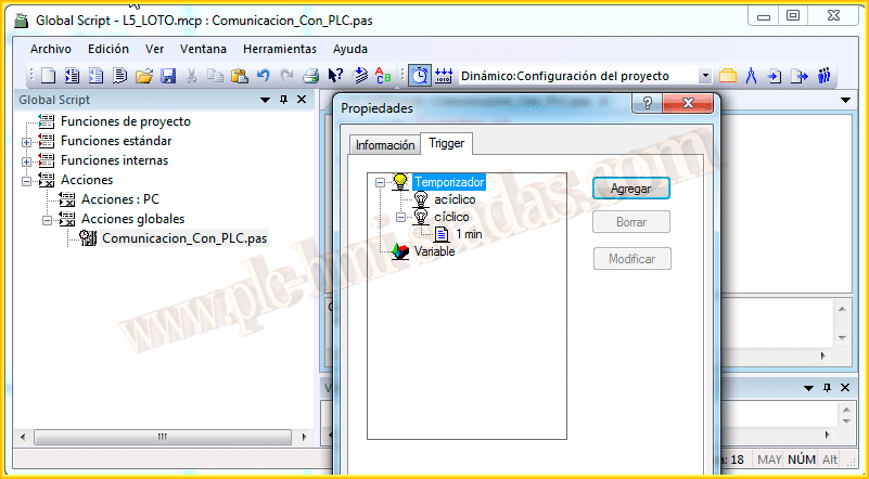 Y lo siguiente que vamos a hacer, es crear una acción ciclica que lo que hace es simplemente poner dicha variable a 1, esto quiere decir, que la ponemos a 1, en el PLC se para el temporizador en el primer segmento, en el segundo segmento se resetea dicha variable, con lo cual el temporizador se reinicia de nuevo y vuelta a empezar.