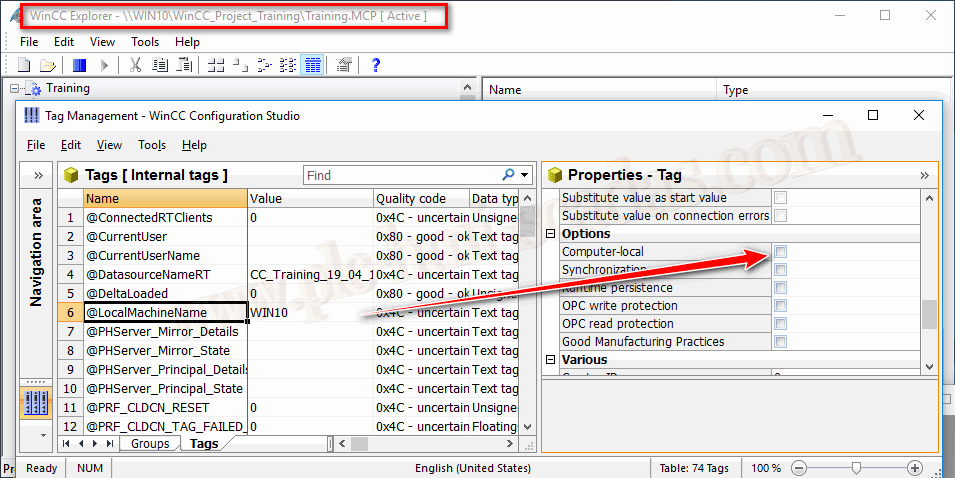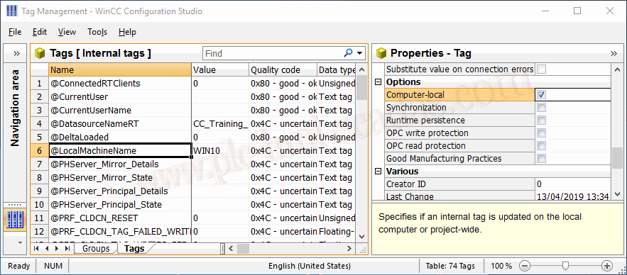 Para una mejor explicación vamos a usar variables de sistema como puede ser @LocalMachineName y si observamos en las opciones, propiedades de este tag, tenemos seleccionado el checkbox Computer-Local, como se puede observar en la imagen, ya nos está informando que si lo tenemos seleccionado, el tag se actualiza en el equipo local o por el contrario en el proyecto, en resumen en el Servidor.