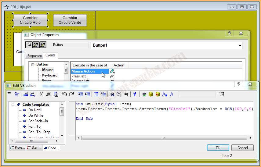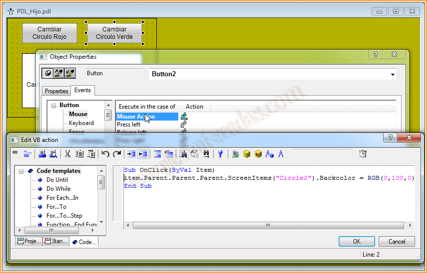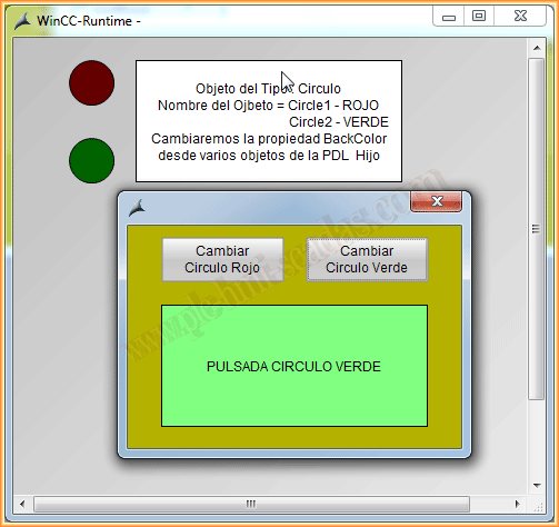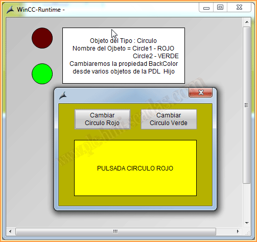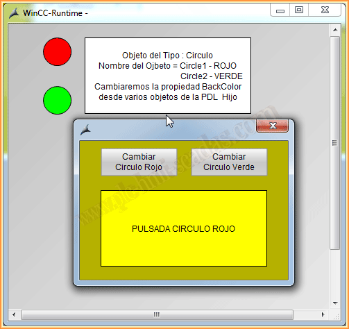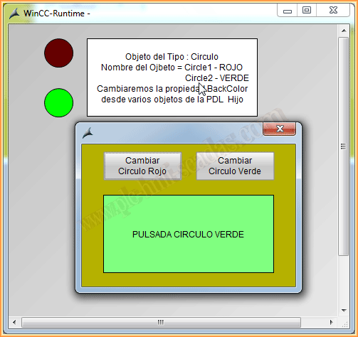 Ya podemos ponerlo en Runtime y probar su funcionamiento. Cuando pulsamos sobre un circulo aparece la ventana de imagen y cambiamos el texto y el color del objeto referenciado. Y viceversa, cuando pulsamos el botón de la pdl del hijo, cambiamos la propiedad backcolor del circulo en cuestión.
