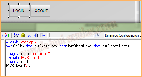Hasta aquí todo perfecto, pero para el Login y Logout, vamos a tener que hacer otra pequeña configuración, vamos a crear dos botones, que podran estar ocultos y vamos a poner el siguiente código en el evento del Raton OnClick, con el primer código hacemos el login y el segundo sirve para el logout