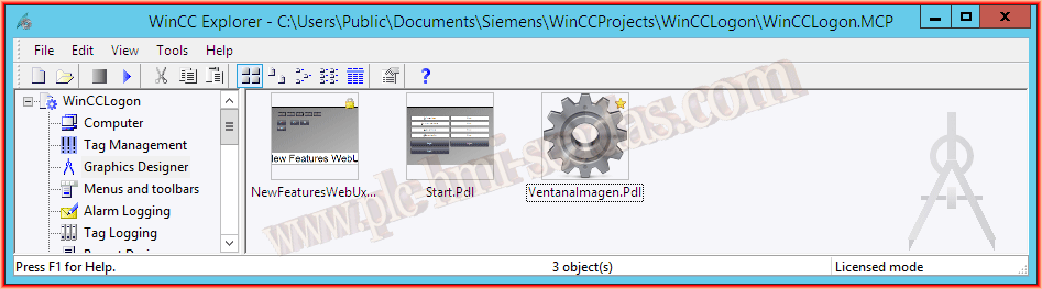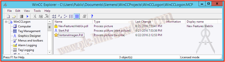 Las novedades para el explorador de WinCC son, nuevo icono para ver las pdl en miniatura, también se aprecia en la esquina superior cuando la pdl esta protegida por contraseña un pequeño candado y si la pdl esta seleccionada como favorito, aparece su pequeña estrella.