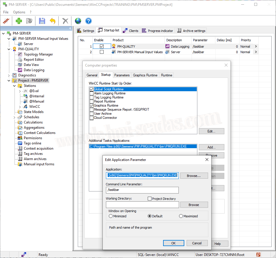 Pero antes de iniciarlo, vamos a configurar que cuando inicie el Runtime, por defecto se inicie el Data Logging, tenemos dos opciones para realizarlo, en el propio proyecto de WinCC donde seleccionamos los servicios que nos interesen, agregamos uno nuevo o bien en la configuración del PM-Server, en el arpartado de Startup List habilitamos este servicio.