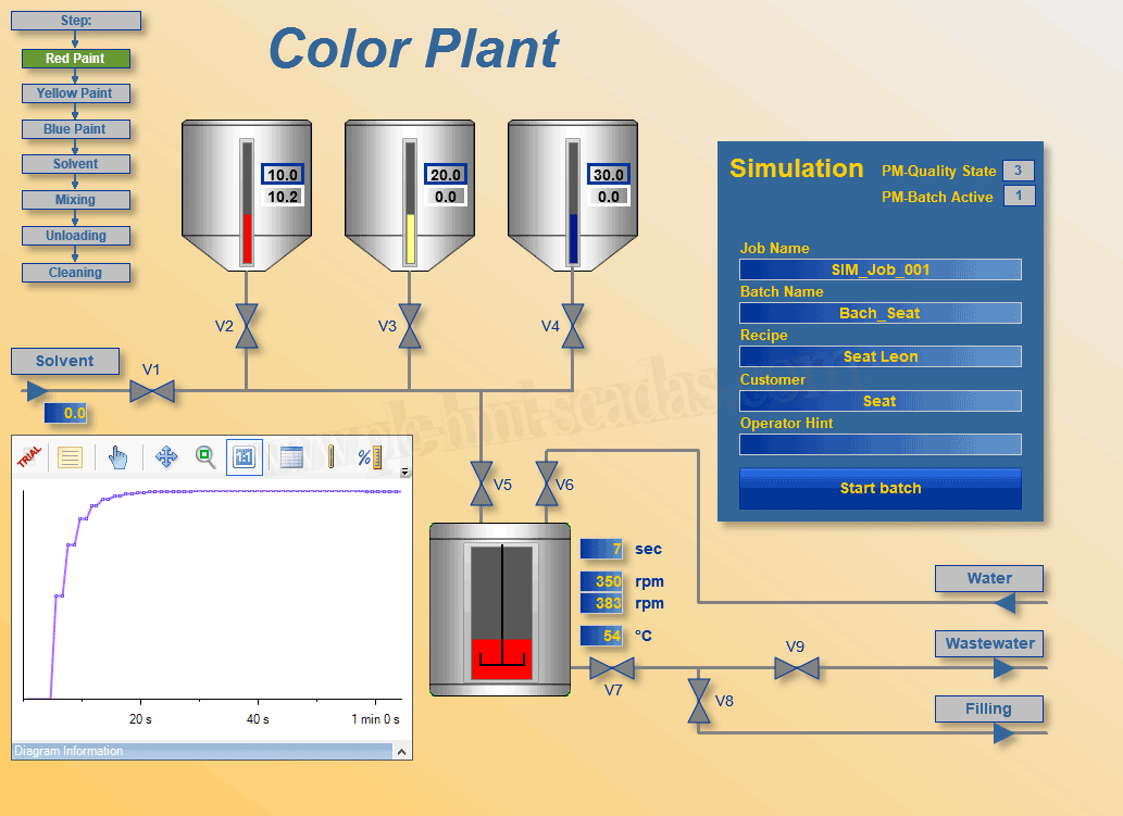 La siguiente imagen es del proyecto demo que vamos a utilizar que ya tiene creado la simulación del proceso con scripts internos en WinCC, con lo cual vamos a aprovechar este recurso.