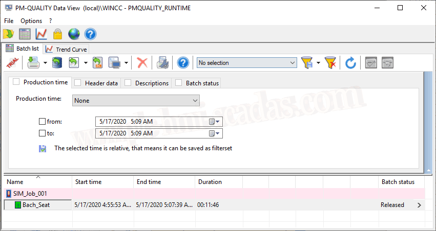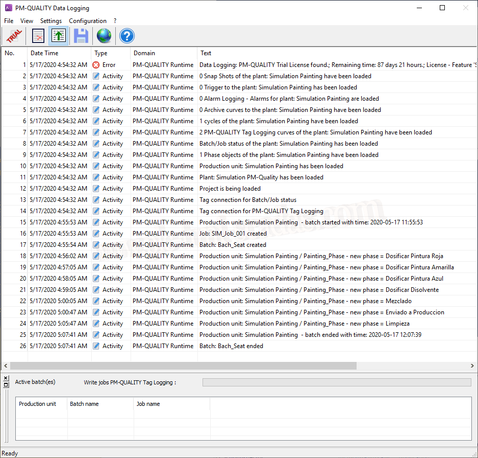 Si iniciamos el Runtime e iniciamos la simulación de nuestro Batch, vamos a ver que, el servicio de Data Logging tiene que estar iniciado y hay se verán los diferentes eventos por los que va evolucionando nuestro Batch.