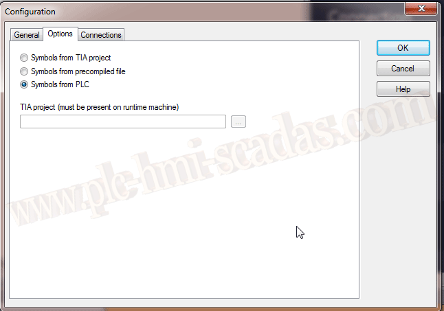 En la pestaña de Opciones, vamos a cargar directamente los símbolos del PLC, para ello, tenemos que tener el PLC conectado y Online