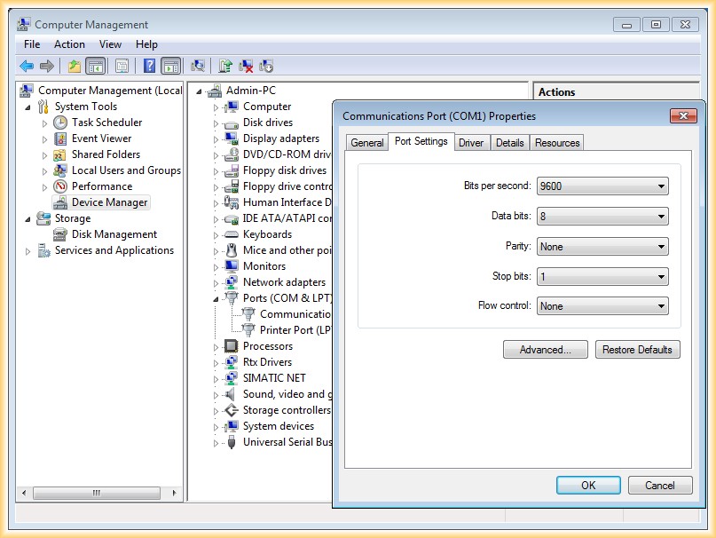 2.- The first step will be configuring the COM Port. To do this, we go to the device manager and configure it with the default values. If these parameters have been changed previously, it is sufficient to restore them.