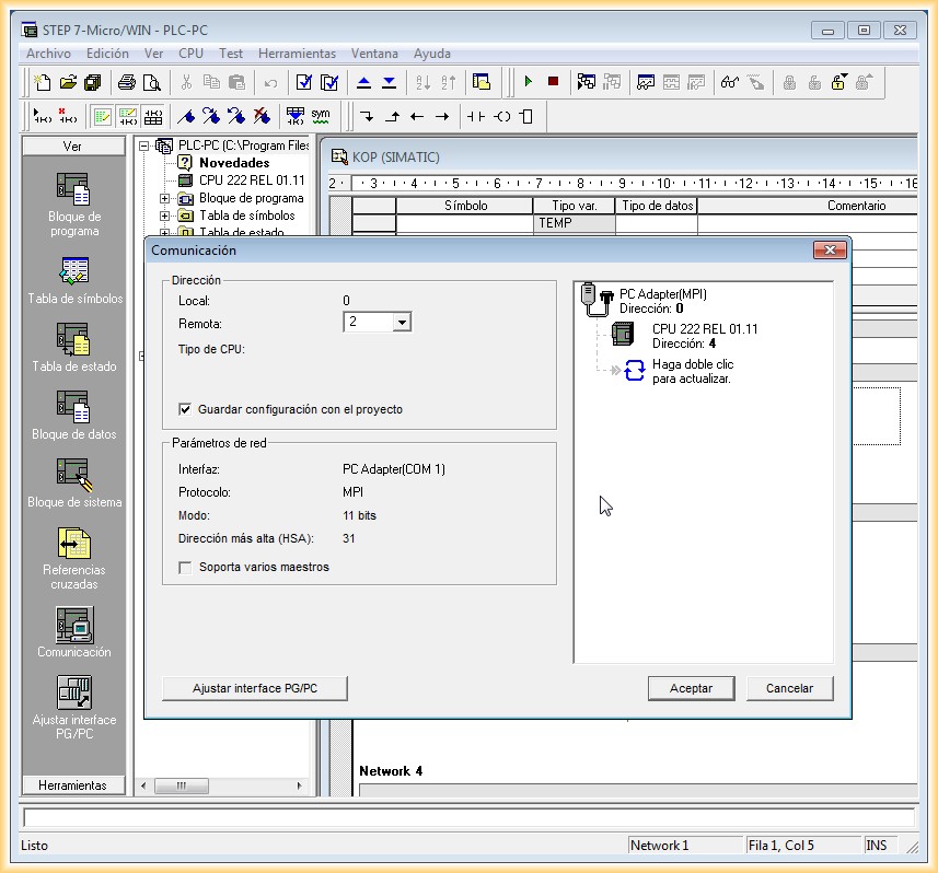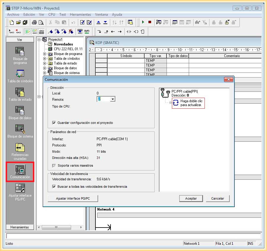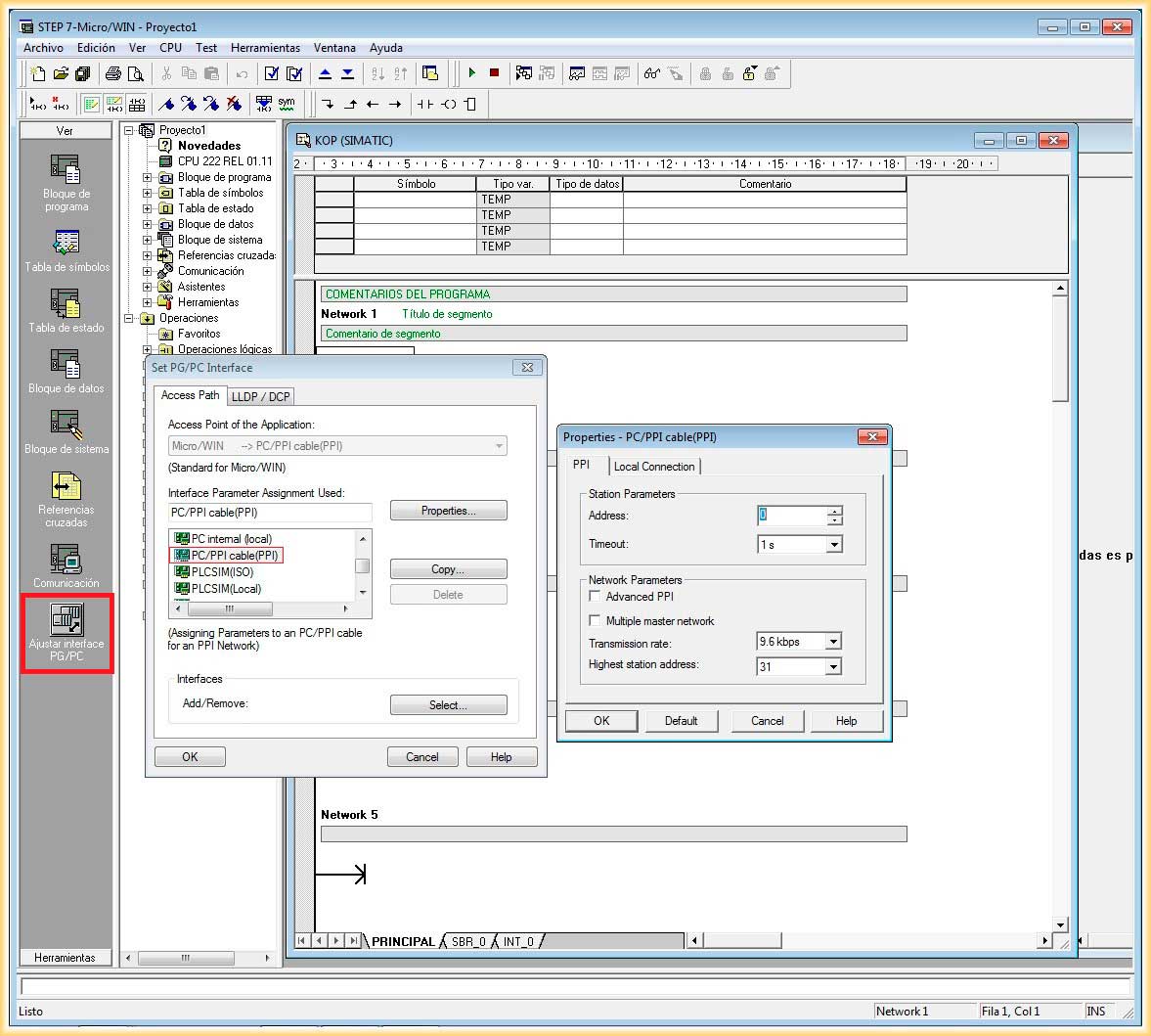 3.- Once this step is completed, we open Microwin and go to the Adjust PC/PG Interface icon, select the PC/PPI interface, leave the PPI properties with the predefined values, and in the Local Connection tab, select the COM Port to be used.